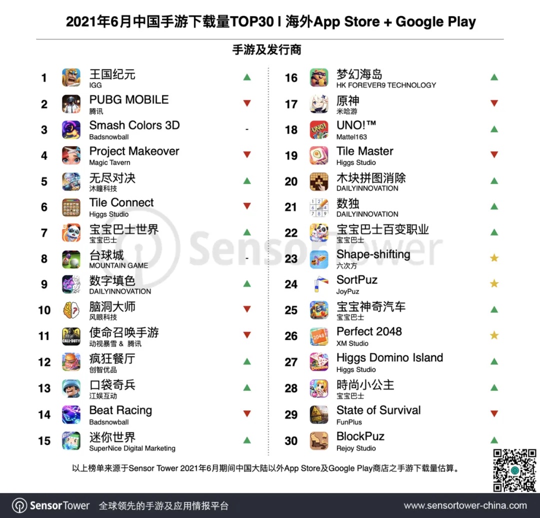 IGG《王国纪元》本期在海外商场取得近940万次下载,是上市至今下载量最高的月份,一起登顶6月出海手游下载榜。