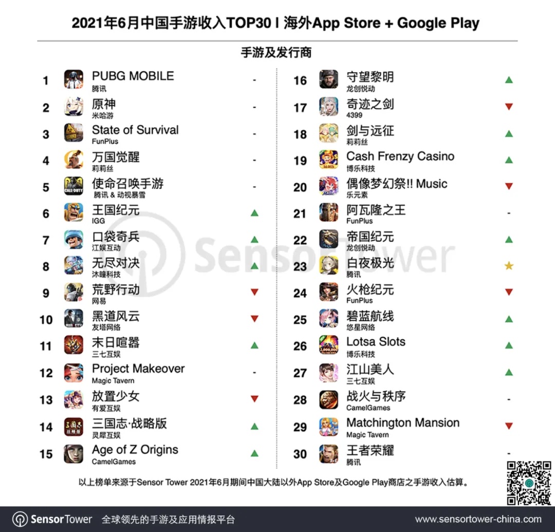在二次元赛道,腾讯游戏亦到达新成果。战棋手游《白夜极光》于6月中旬登陆日韩、欧美、东南亚等多个海外商场,本期收入逾越1700万美元,空降榜单第23名。在巨子树立的日本商场,该游戏上市半个月位列手游热销榜第11名,成为计算期内体现最好的外国手游。