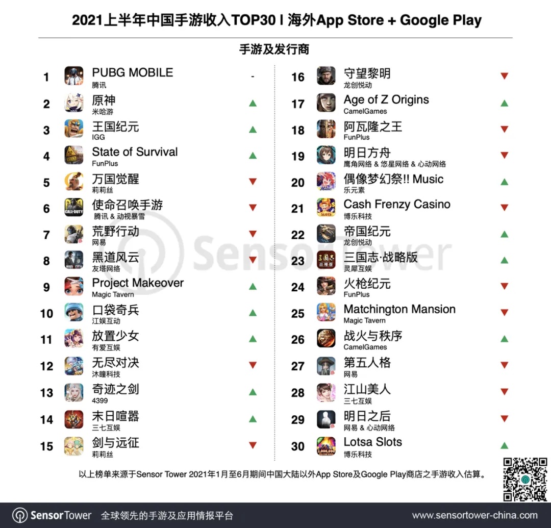 2021上半年海外收入最高的我国手游依然是腾讯《PUBG Mobile》,到达6.24亿美元,同比增加17.7%。米哈游《原神》移动端海外收入相同逾越6亿美元,位列榜单第2名。