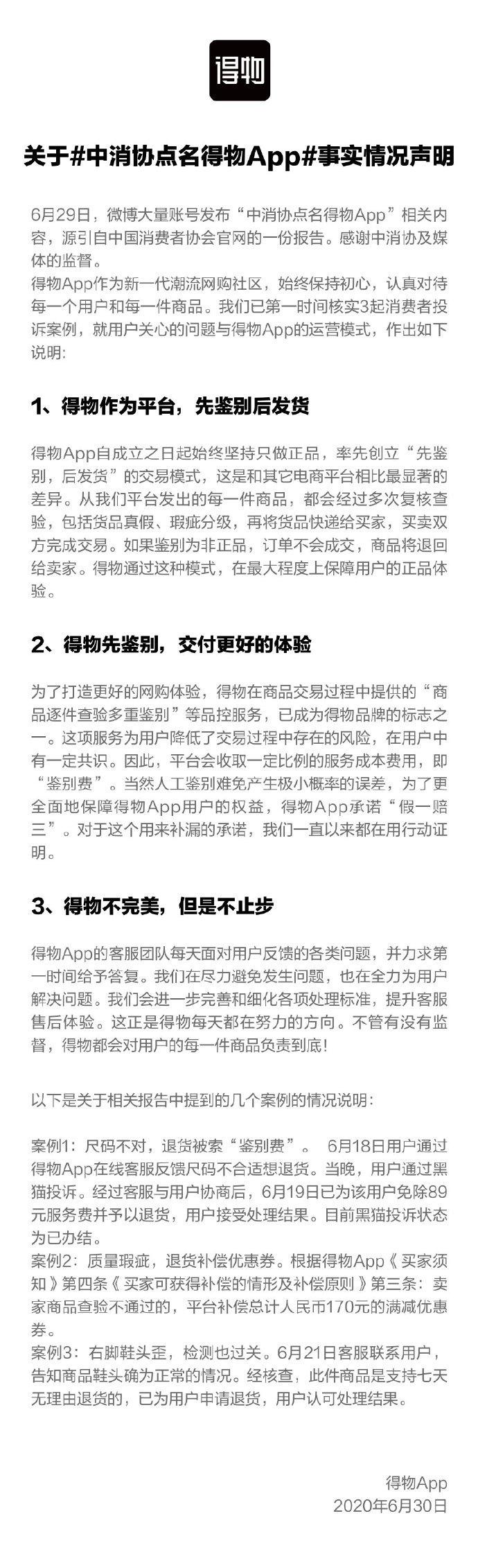 ,表明以上三起用户售后事例均已及时处理结束。得物还表明,感谢中消协及媒体的监督。